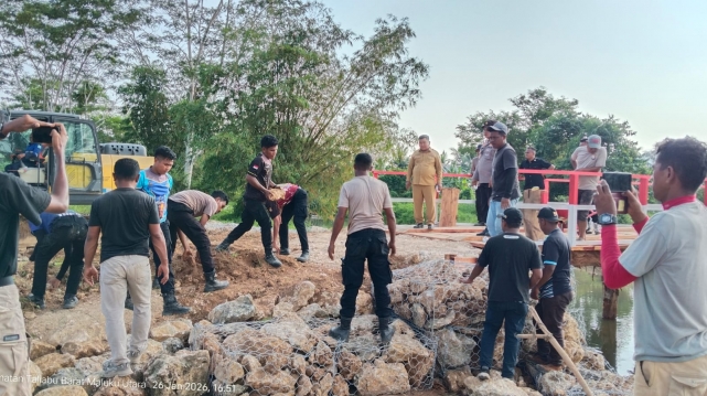 Humas,- Progres pembangunan jembatan penyeberangan di Dusun Tanjung Sari, Desa Wayo, Kecamatan Taliabu Barat kini hampir rampung berkat sinergi cepat antara Pemerintah Kabupaten Pulau Taliabu, Polres Taliabu, dan Brimob Kompi 4 Batalion C Pelopor.