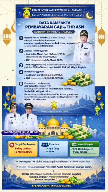 Pasalnya, Badan Pengelola Keuangan dan Aset Daerah (BPKAD) Kabupaten Pulau Taliabu memastikan anggaran Tunjangan Hari Raya (THR) Idulfitri 1447 Hijriah sudah siap disalurkan.